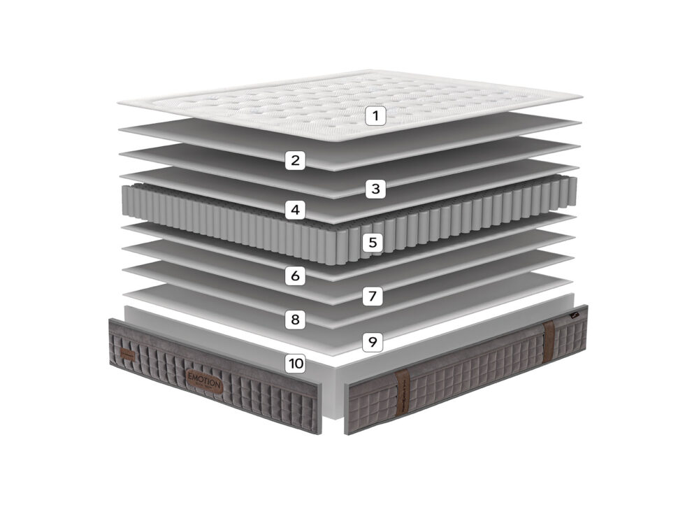 El colchón Emotion está recomendado para personas de tamaño XL, gracias a su núcleo de muelles ensacados de alta resistencia. Posee un alto nivel de firmeza y transpirabilidad que lo hacen ideal para personas calurosas. Además posee la justa combinación entre firmeza y adaptación para proporcionarle un alto nivel de confort.