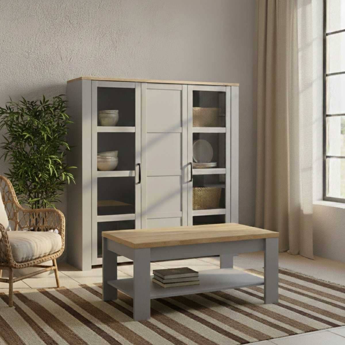 La mesa de centro modelo Telner es una pieza ideal para completar el salón con un estilo moderno, acogedor y funcional. Su diseño combina acabados en tonos claros con una tapa en efecto madera natural, creando un contraste elegante que aporta calidez al ambiente.